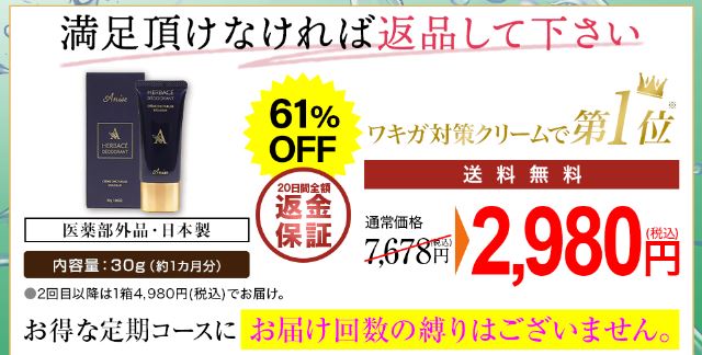 なお、公式サイトから定期コースに申し込むと、アニセ 薬用デオドラントクリームを初回限定で61%OFFの税込2,980円で購入でき、20日間返金保証もついていてお得です。
