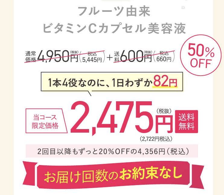 続けて調査したところ、公式サイトから定期コースに申し込むと、フルーシーを初回限定で50%OFFの税込2,722円で購入できることが分かりました!