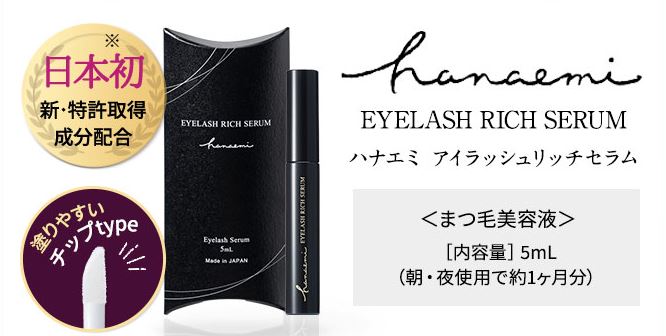 ハナエミ アイラッシュリッチセラムとは、日本で始めて「チャーガエキス」が配合されたまつ毛美容液で、評判も良い商品です。